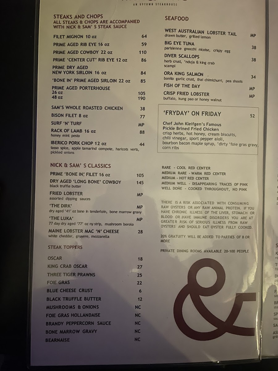 Dining Atmosphere: The ambiance at Nick & Sam’s strikes a perfect balance between upscale and welcoming. Guests describe it as having a modern and lively decor that encourages a celebratory atmosphere, enhanced by vibrant bar music that sets the mood for fun yet relaxed conversations. Although tables can be closely seated, this cozy arrangement fosters a lively energy that complements the overall dining experience. Patrons have noted that birthdays at Nick & Sam’s are extra special, thanks to the dramatic cotton candy displays lit with sparklers—truly a sight to behold!